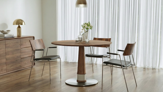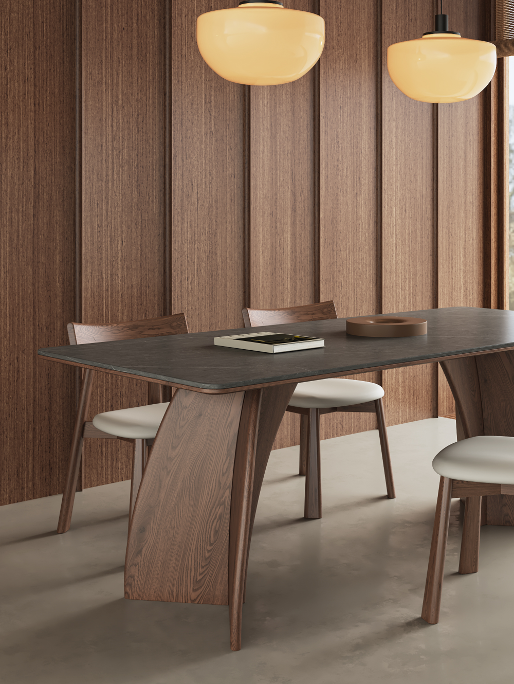 Explore MoreWalnut meets industrial steel for a dining experience of quiet strength.