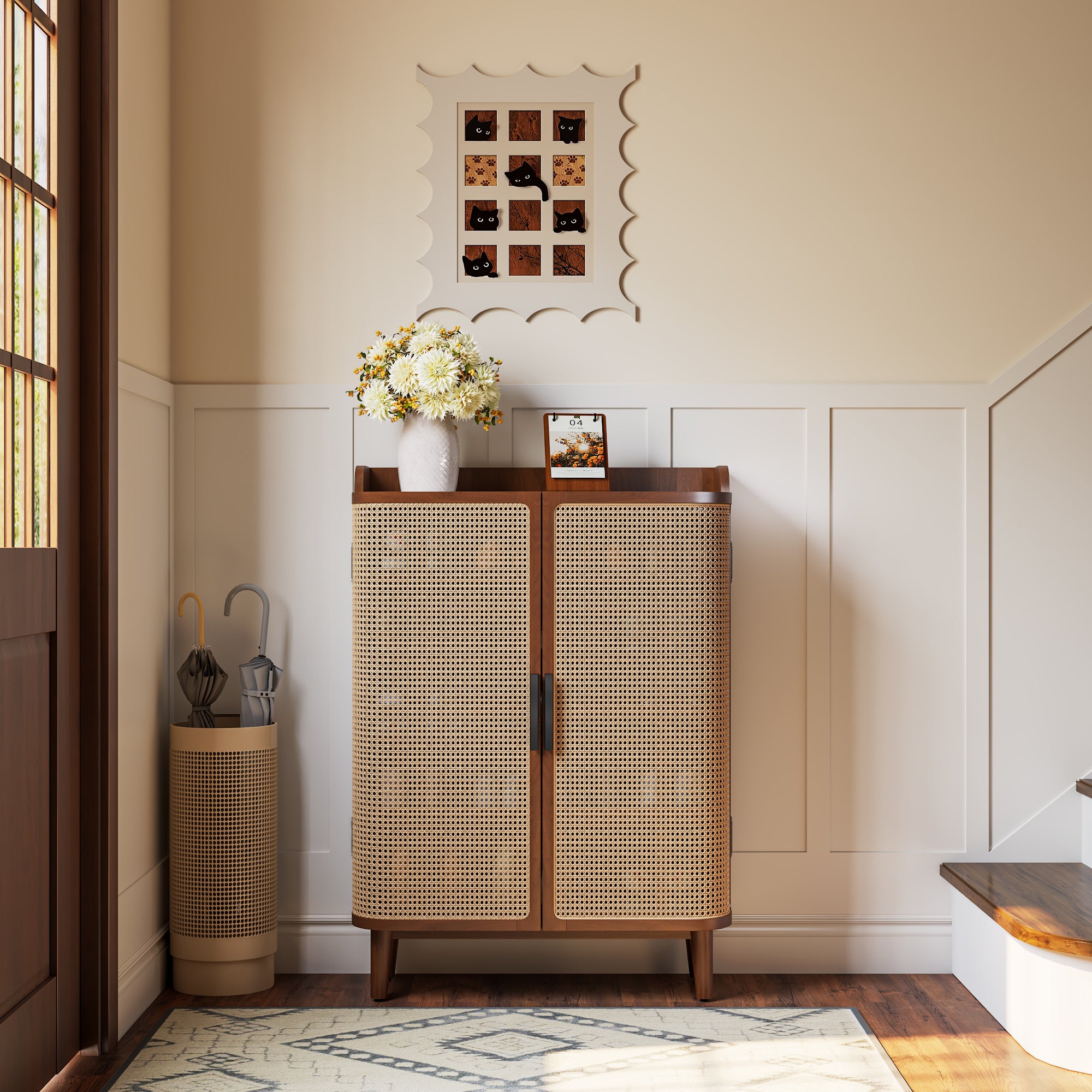 Modern rattan shoe cabinet for entryway also as rattan sideboard storage, featuring a striking blend of natural rattan cane doors and a rich wooden frame, this cabinet exudes timeless elegance. The spacious interior provides ample storage, while the slim, tapered legs add a touch of sophistication.