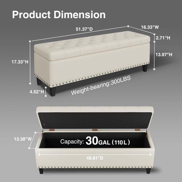 Large Storage Space---Our 51-inch rectangle ottoman has a large interior storage space with 30 gallons (110L) capacity. This bench with storage can help you store books, blankets, pillows, toys, clothes, and shoes in a tidy, organized, and hidden way, meeting the storage needs of various daily items in the family.