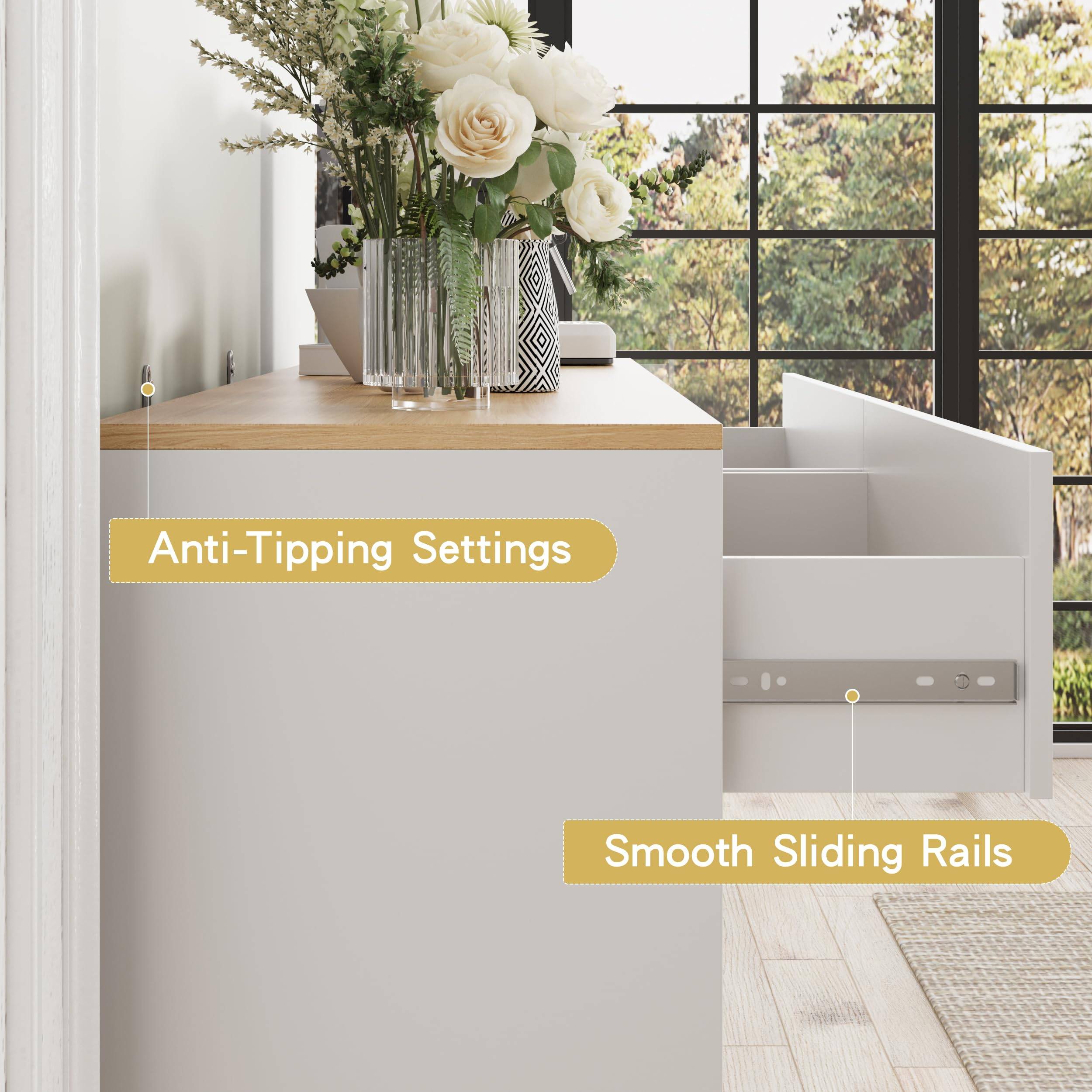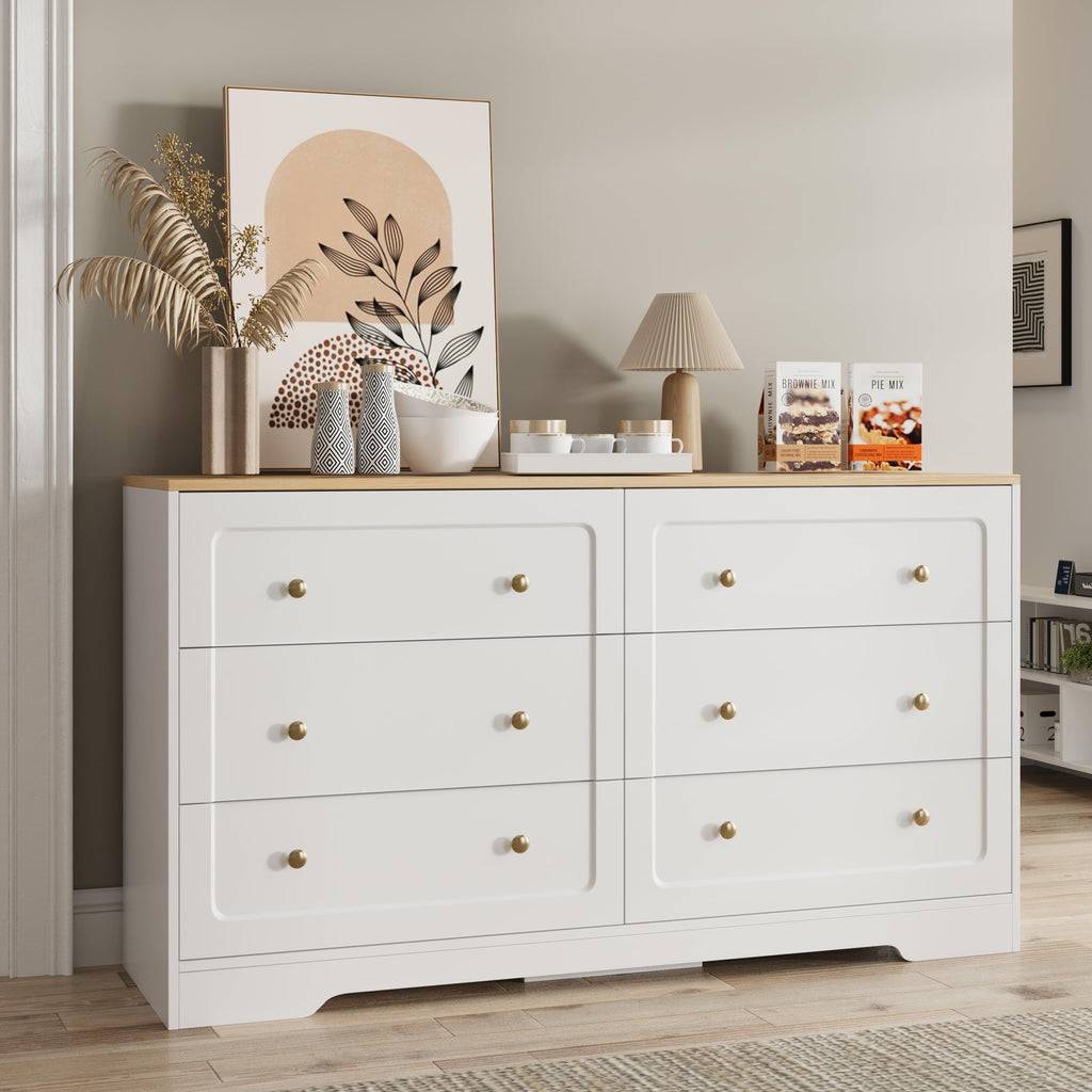 White storage cabinet with large capacity drawers: The wooden dresser has 6 spacious storage drawers with a large desktop. Providing ample storage space, you can easily organize and categorize your wardrobe essentials. Its spacious tabletop serves as a stylish canvas to showcase framed photos, artistic accents, and more beautifully.