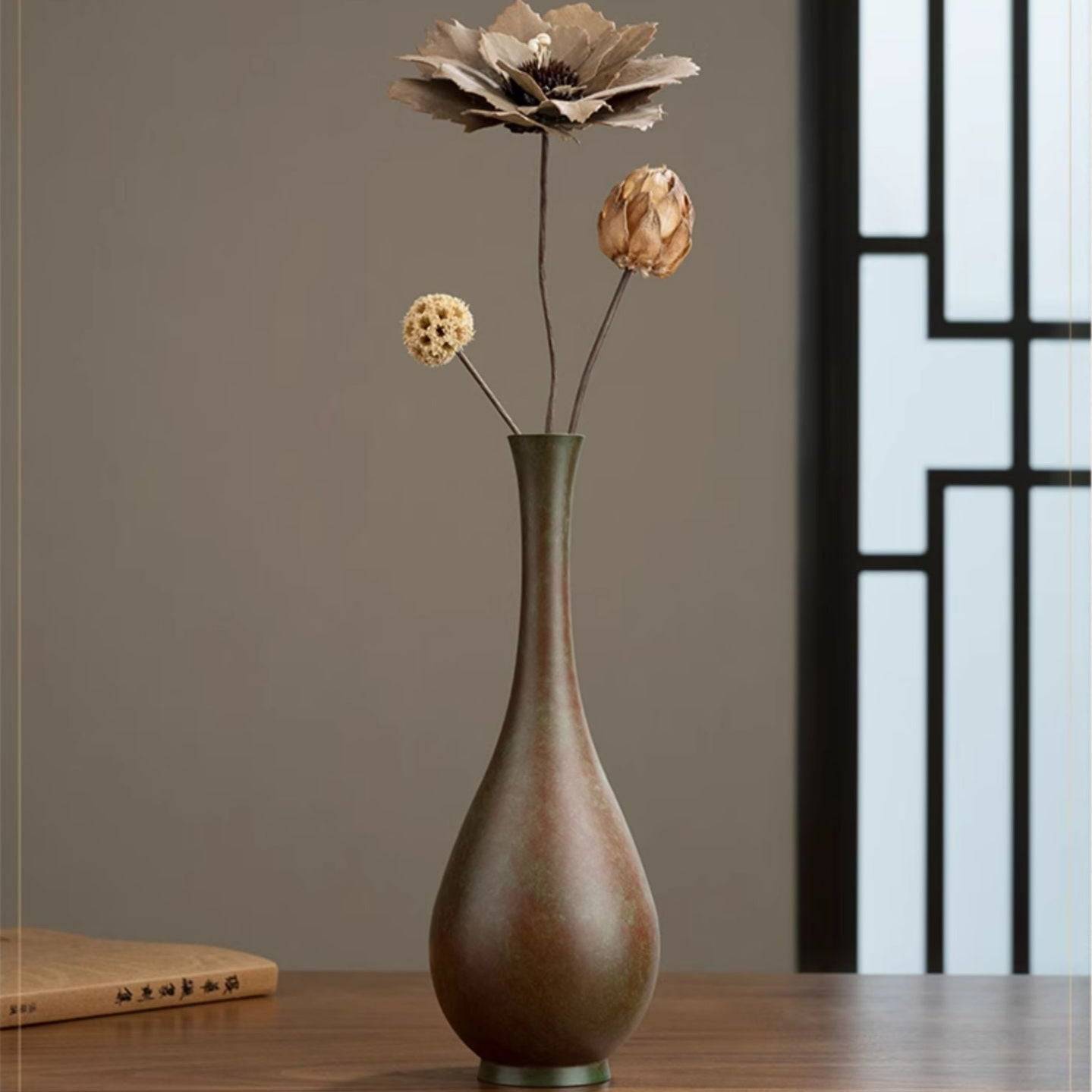 This bronze vase is inspired by classical craftsmanship and combines modern materials with vintage techniques to present a unique retro texture. The surface has undergone bronze like oxidation treatment, with rich color layers and a steady and atmospheric metallic luster. It has both artistic style and practicality, and can be used for flower arrangement or displayed separately.