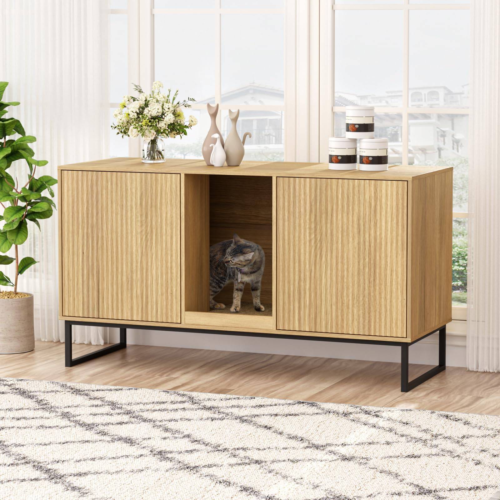 Modern hidden cat litter box enclosure to give your cat a private space while elevating your home's style. Its elegant design blends with your home decor, keeping your space tidy and organized, all while giving your cat a cozy retreat, seamlessly hiding your cat's litter box while reducing unpleasant odors. The furniture hidden is crafted from high-density MDF board and features sturdy metal shelves frame, ensuring exceptional durability and stability.
