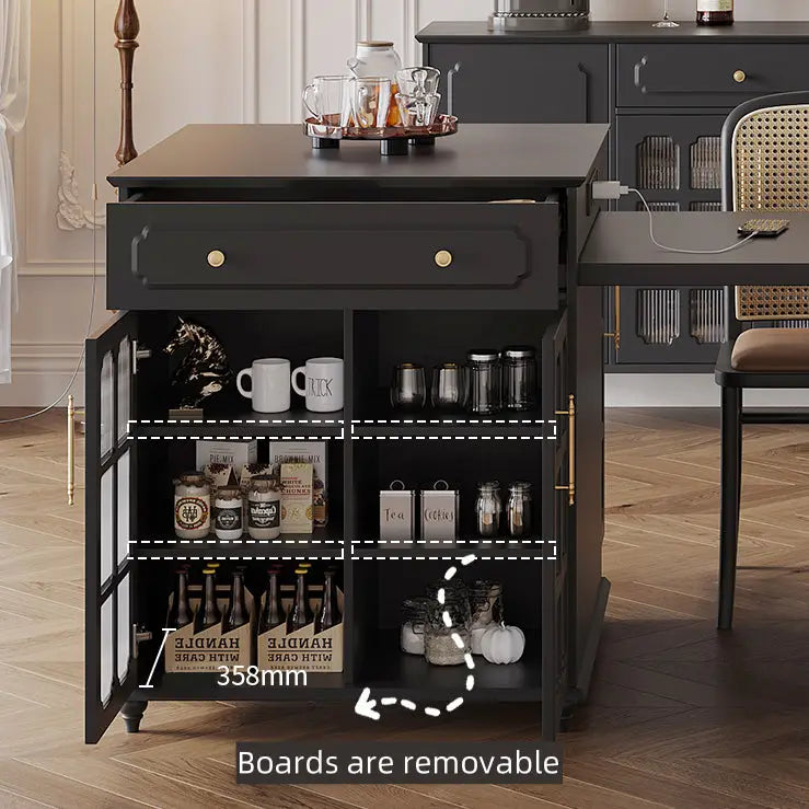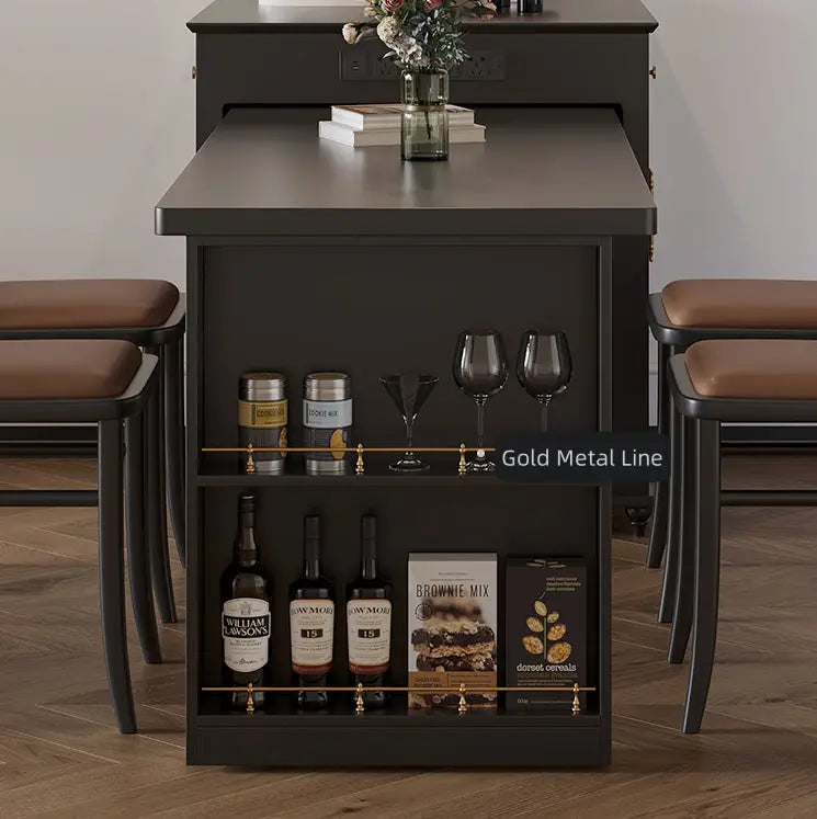 This dining set is not just about looks; it's designed with practicality in mind. No more searching for outlet a keep your devices powered up and ready to go, seamlessly integrating technology into your life. The table features built-in storage solutions, including cabinets, shelves and compartments for storing your dining essentials, such as plates, glasses, and cutlery. The integrated wine rack adds a touch of sophistication and convenience, keeping your favorite bottles within reach.
