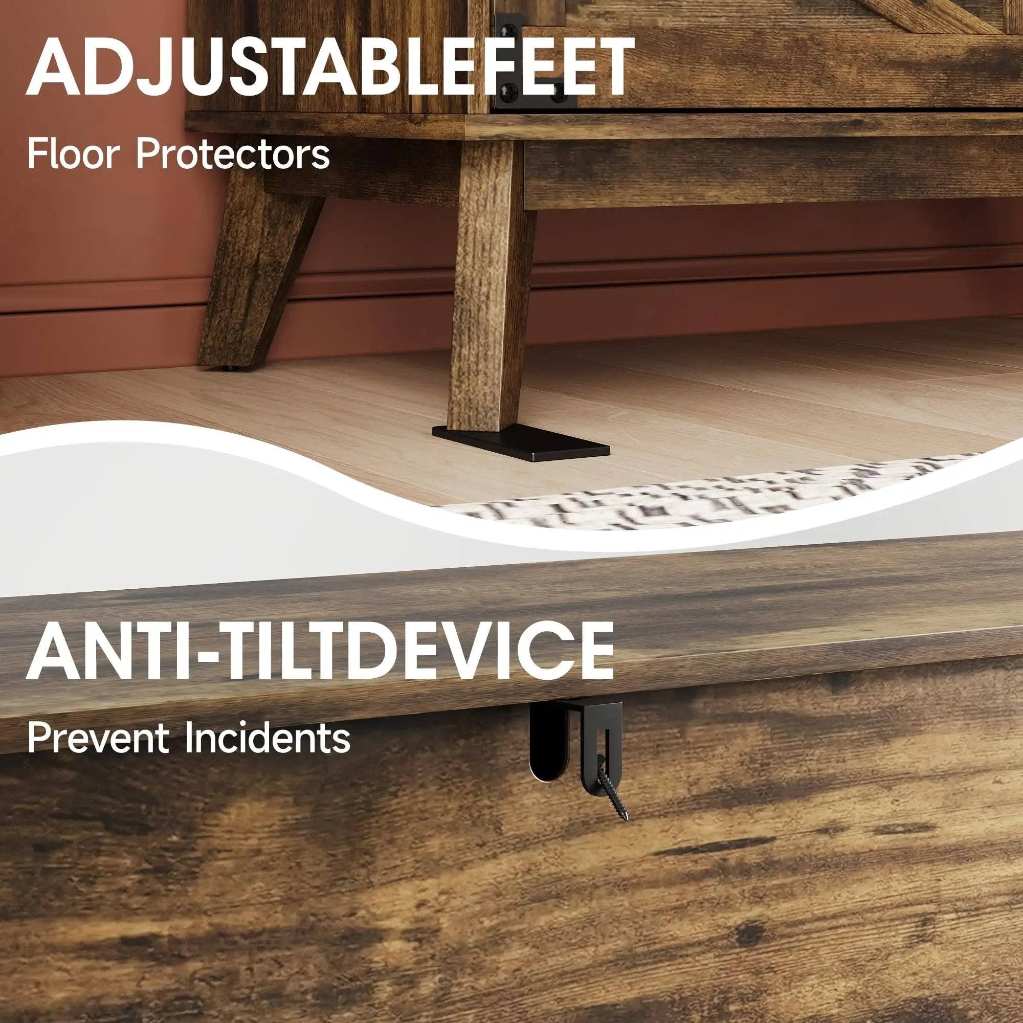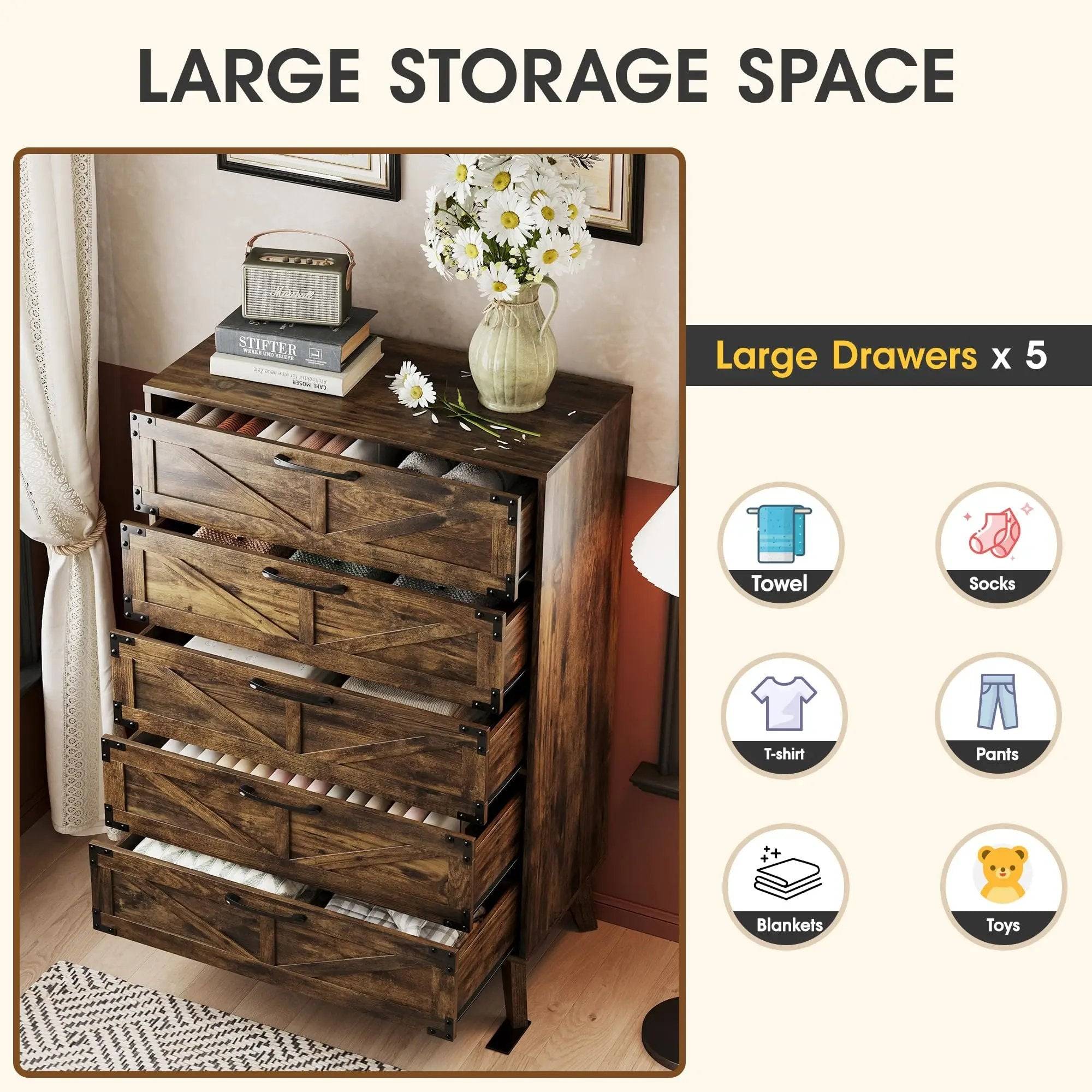 Farmhouse wooden 5 drawer dresser is crafted from sturdy wood and engineered wood, ensuring its durability and stability.The widened metal matte handles enhance aesthetics and provide a comfortable grip. The thickened tabletop withstands heavier weights without deformation or damage. The heightened base enhances stability for safe and reliable use.