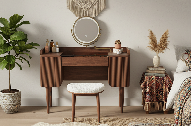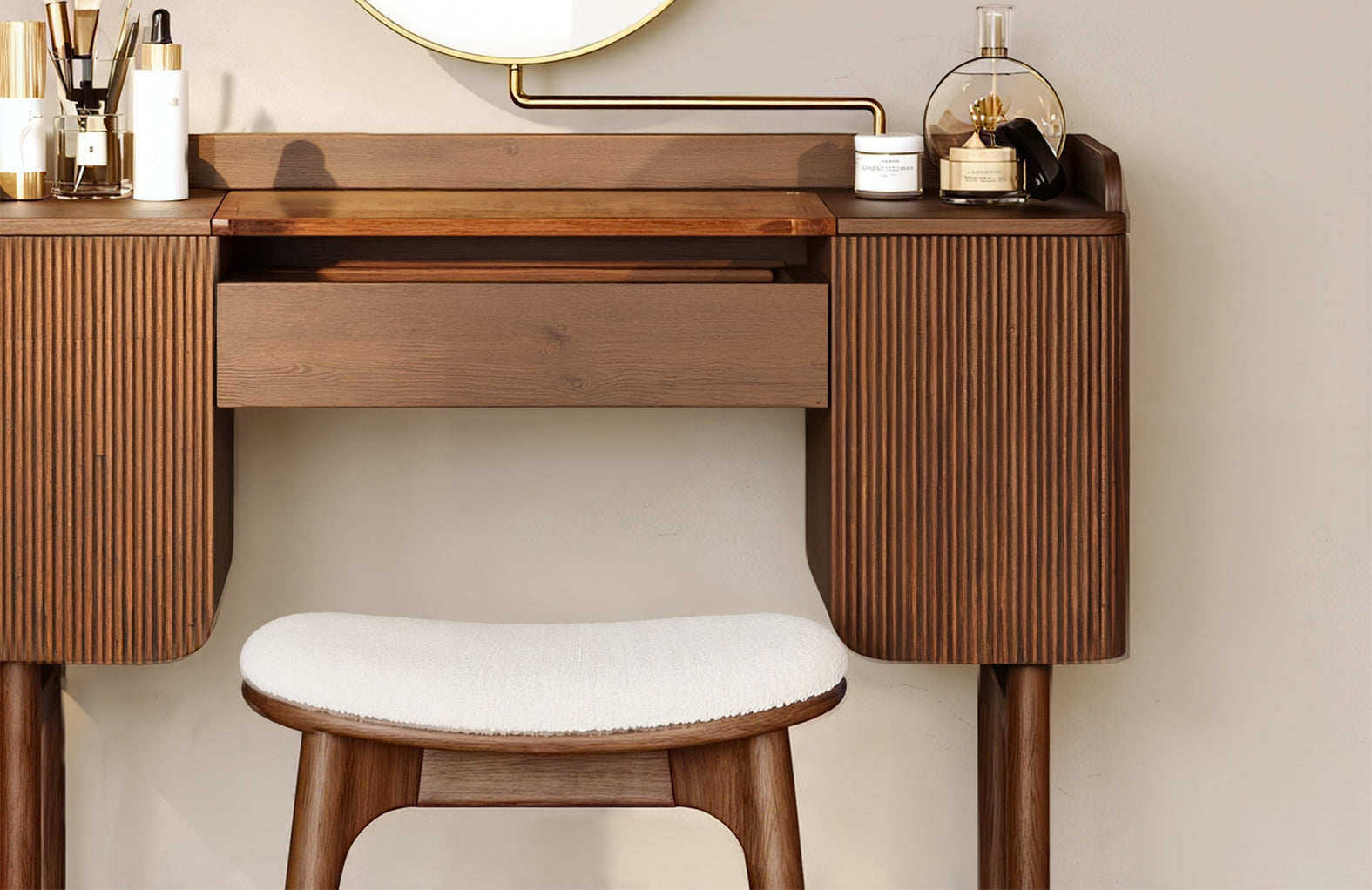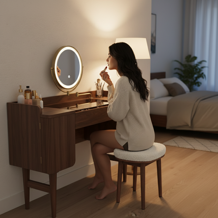 This makeup vanity combines elegance and functionality, featuring a sophisticated walnut finish that seamlessly fits into various home decor styles. It comes with a rotating mirror. The vanity offers multiple storage and display spaces, including shelves, drawers, and storage compartments inside the cabinet doors, making it easy to organize makeup, skincare products, and other small items. The included comfortable stool ensures an optimal seating experience during makeup sessions.