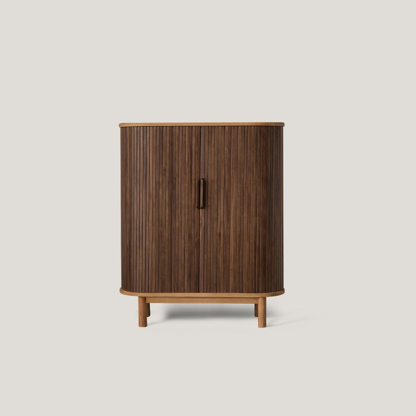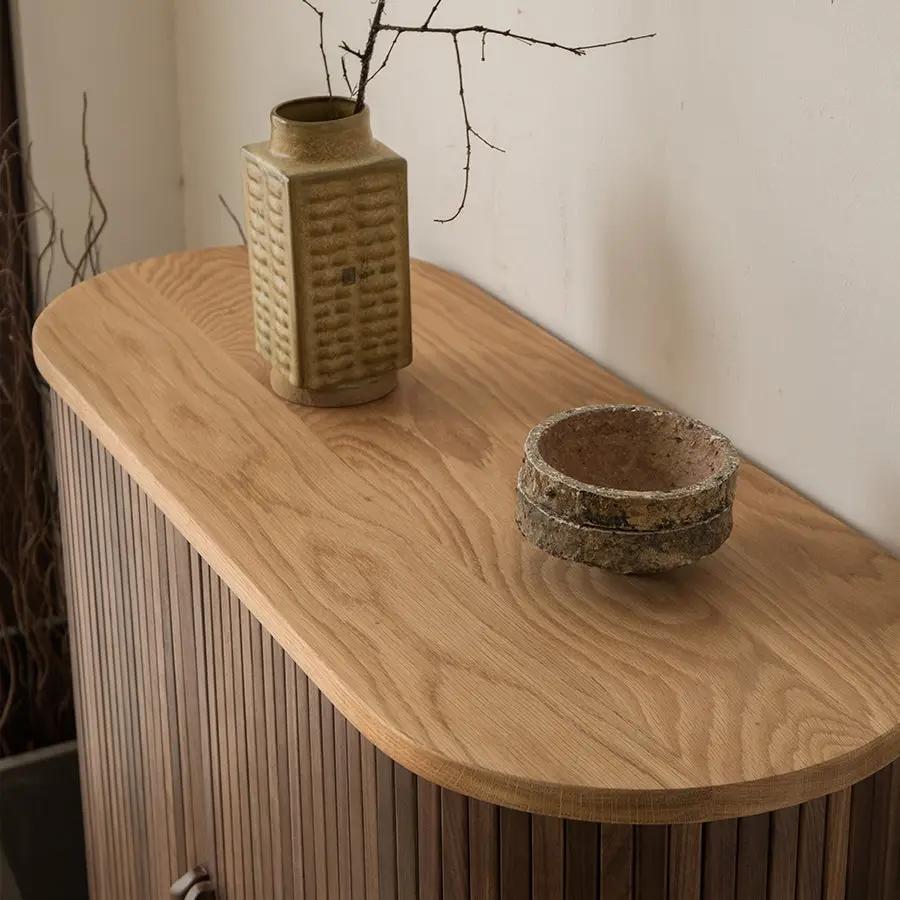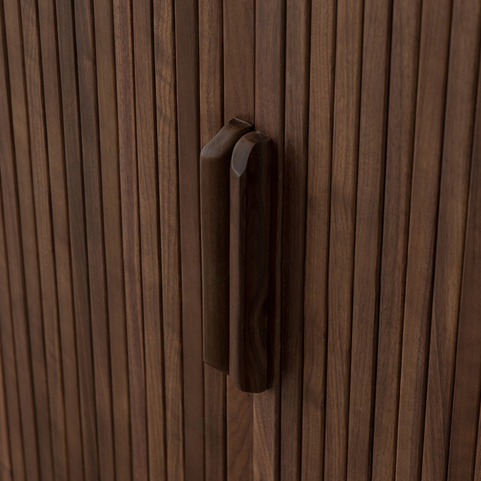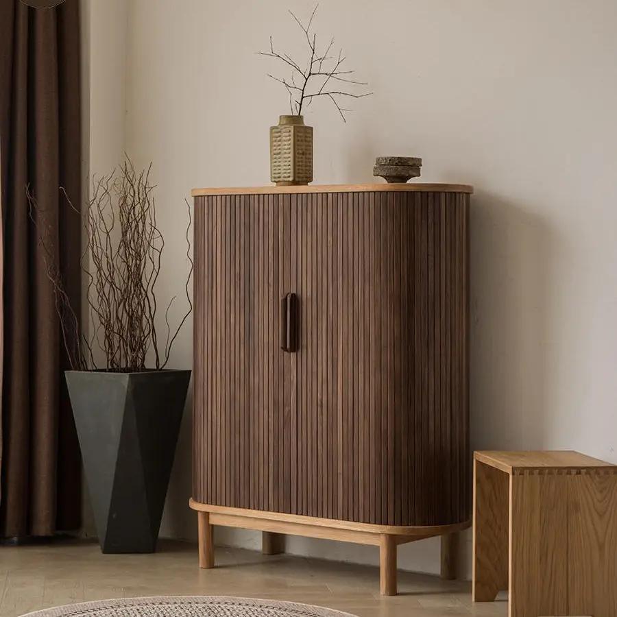 The cabinet features a sleek design with a warm wood finish, showcasing the natural beauty of the wood grain. It comes with sliding doors, providing easy access to the spacious interior shelves. This piece is versatile, serving as a stylish storage solution for your living room, dining area, or hallway.