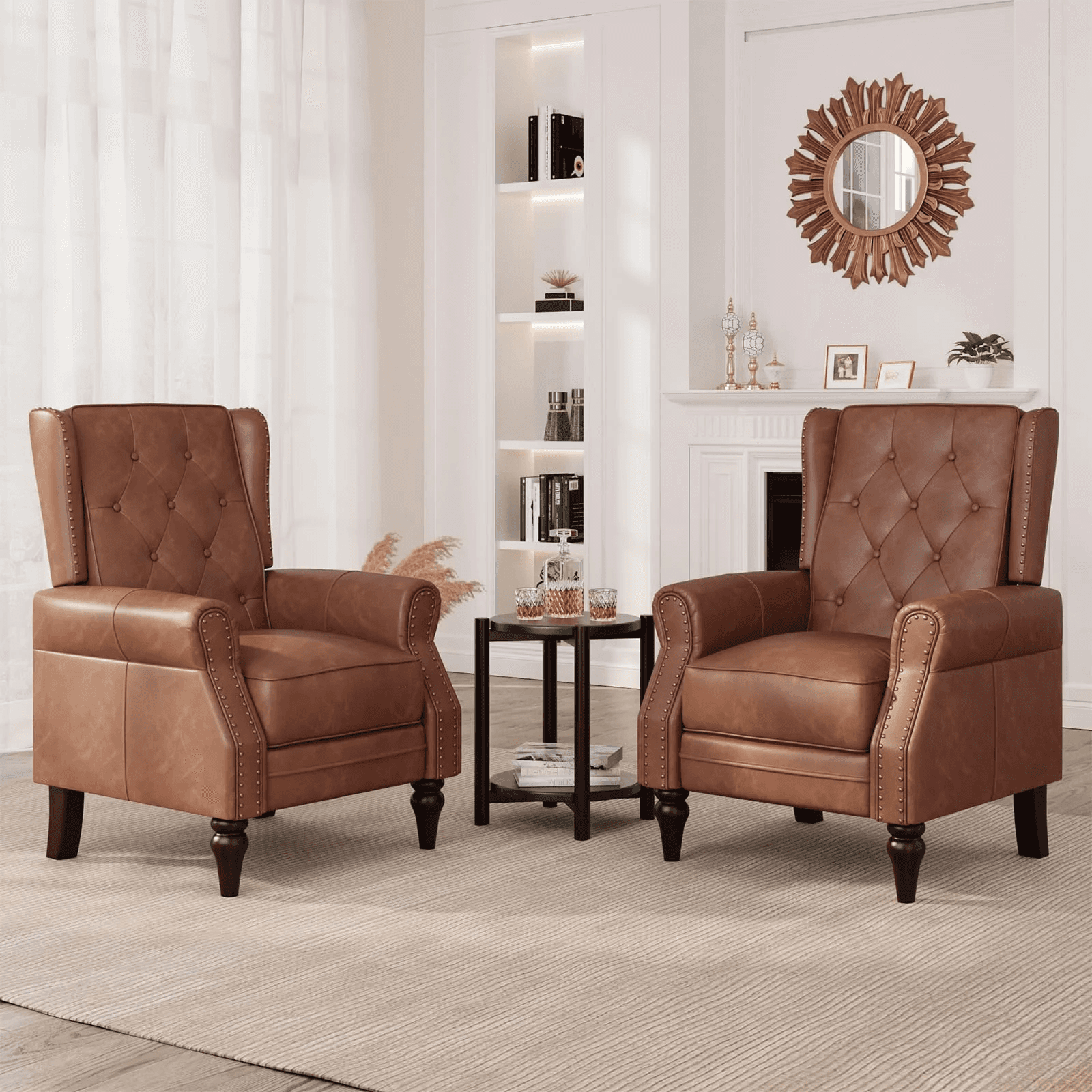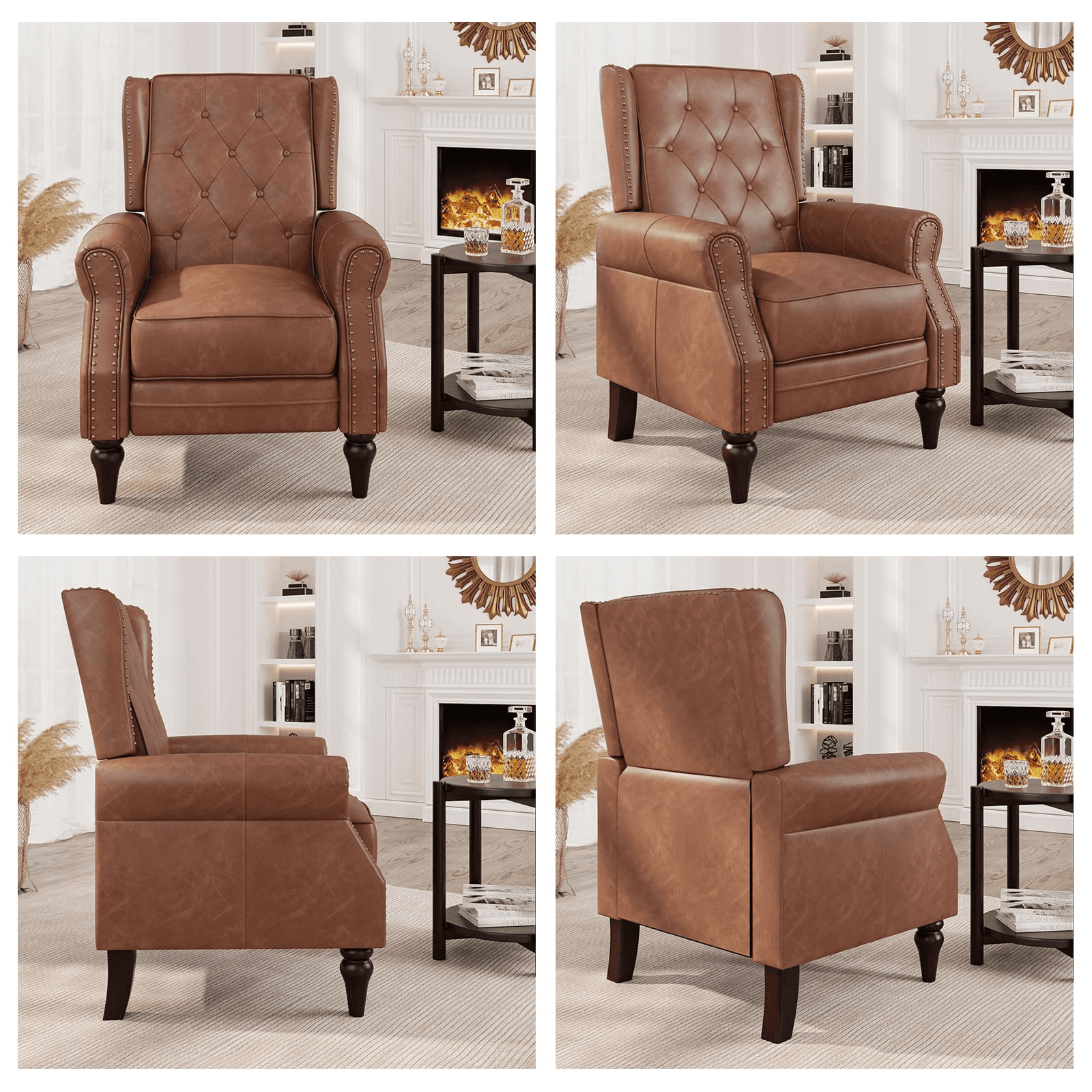 Modern accent chair single sofa recliner chair is made of breathable faux leather, backrest and seat cushions are lined with high-density foam, 140 degree adjustable backrest, suitable for reading, chatting, ideal for living room, office, salon, club. They feature a thick cushion and a medium-sized solid back, providing relief from back and waist pressure for a comfortable seat experience. The solid wood feet exude a retro atmosphere, enhancing the armchair firmness and stability.