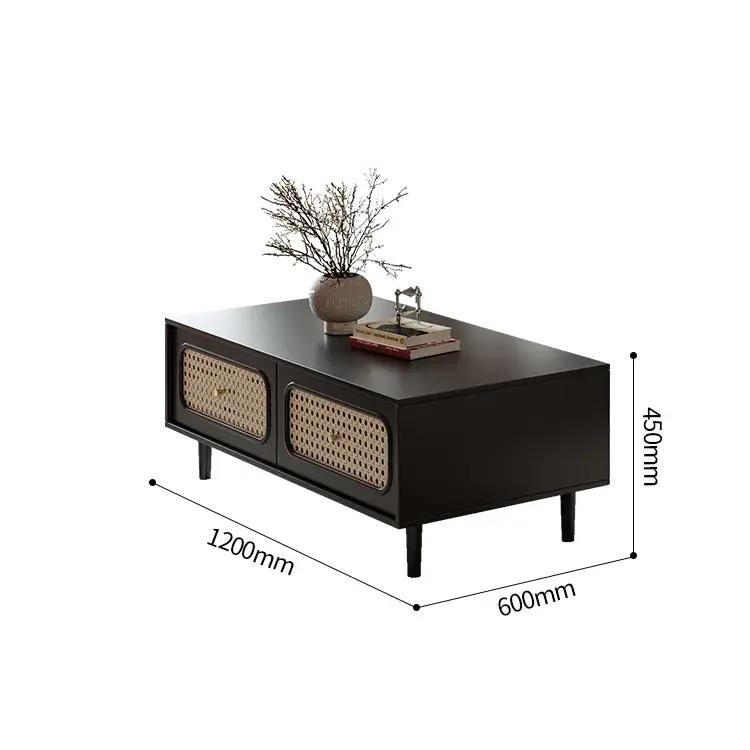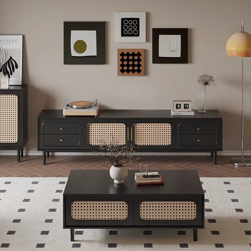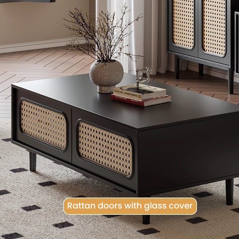 Elevate your living room with our Modern Black Coffee Table, featuring stylish rattan drawers for a blend of contemporary design and practical storage. This elegant piece is perfect for adding sophistication and functionality to your home decor.