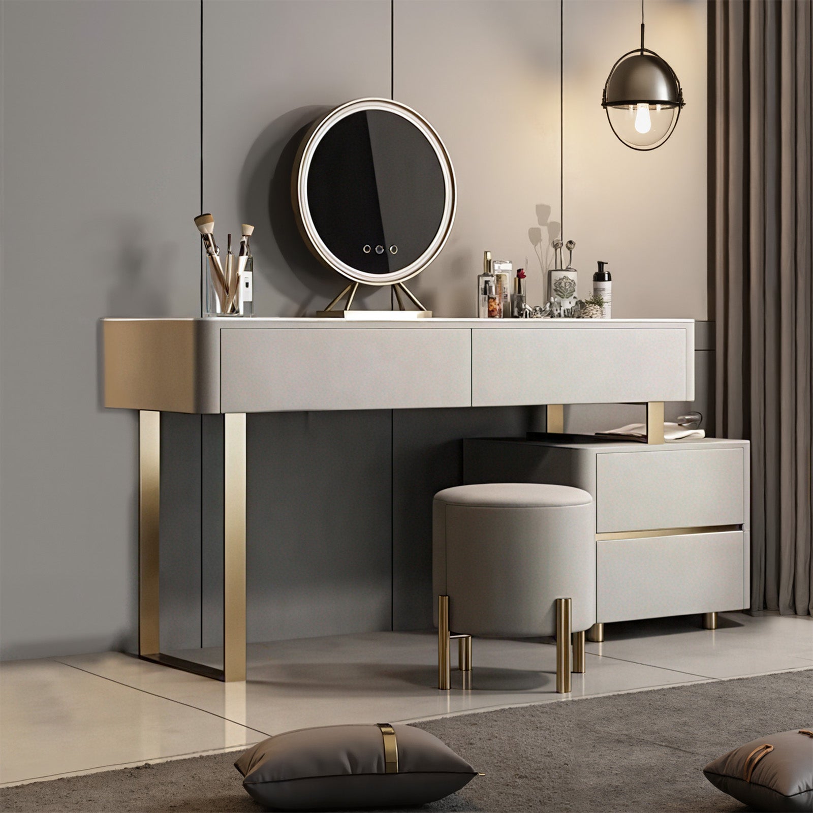 The surface of the vanity is wrapped in durable, eco-friendly microfiber leather, known for its strong breathability, comfortable touch, and easy maintenance.
