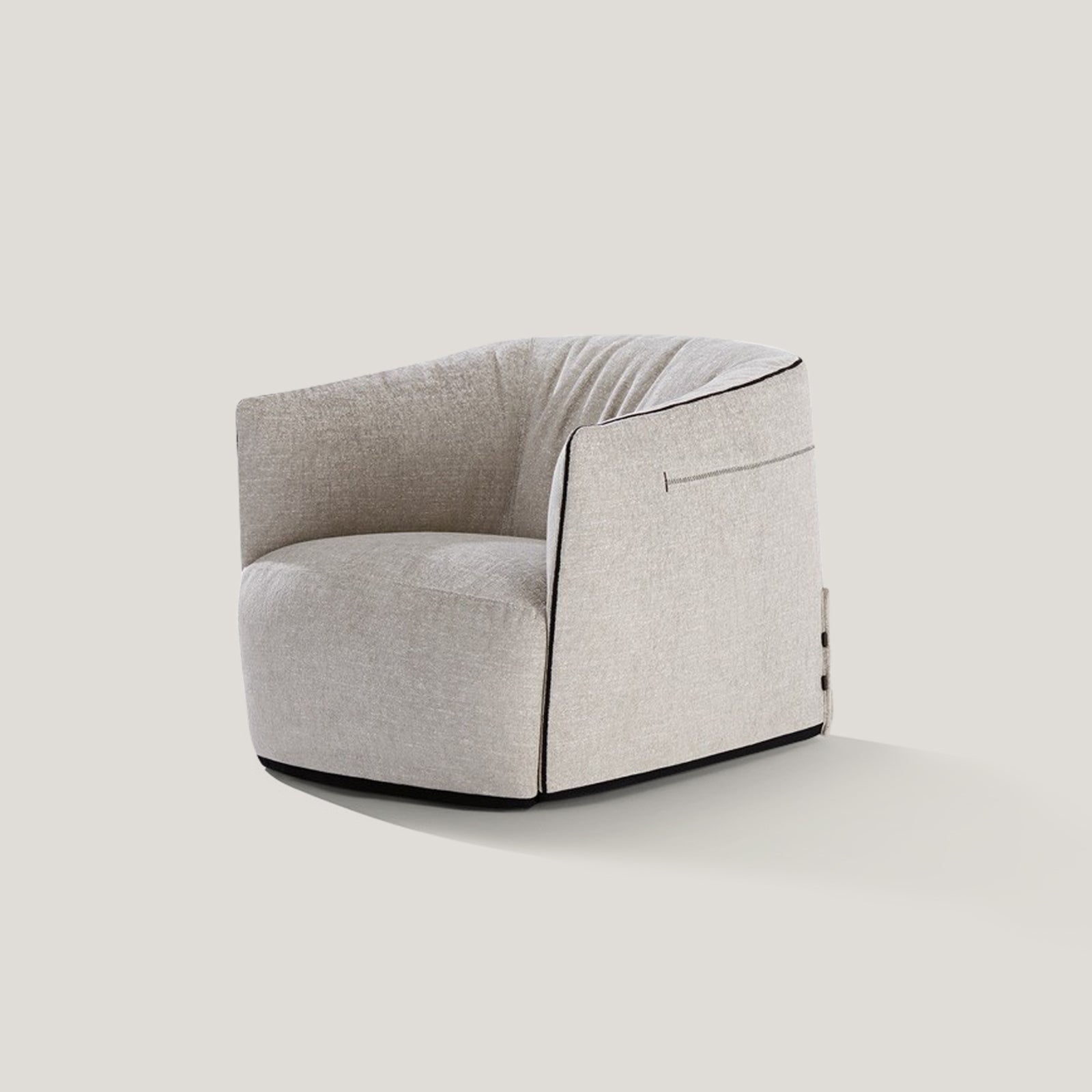 The armchair features enveloping, comfortable forms and sartorial details. The round padding gives it a pleasantly casual look.