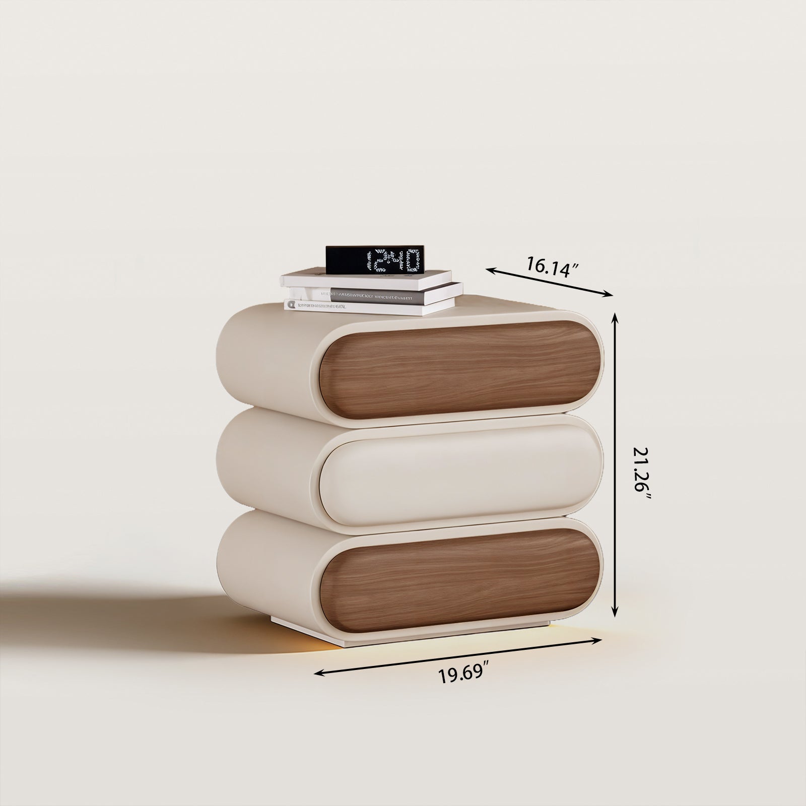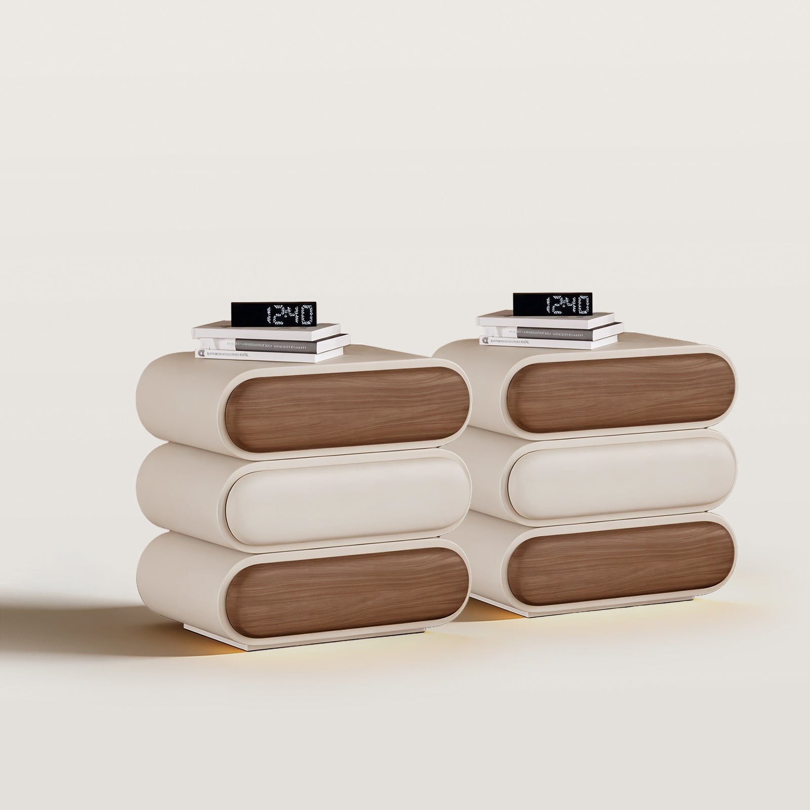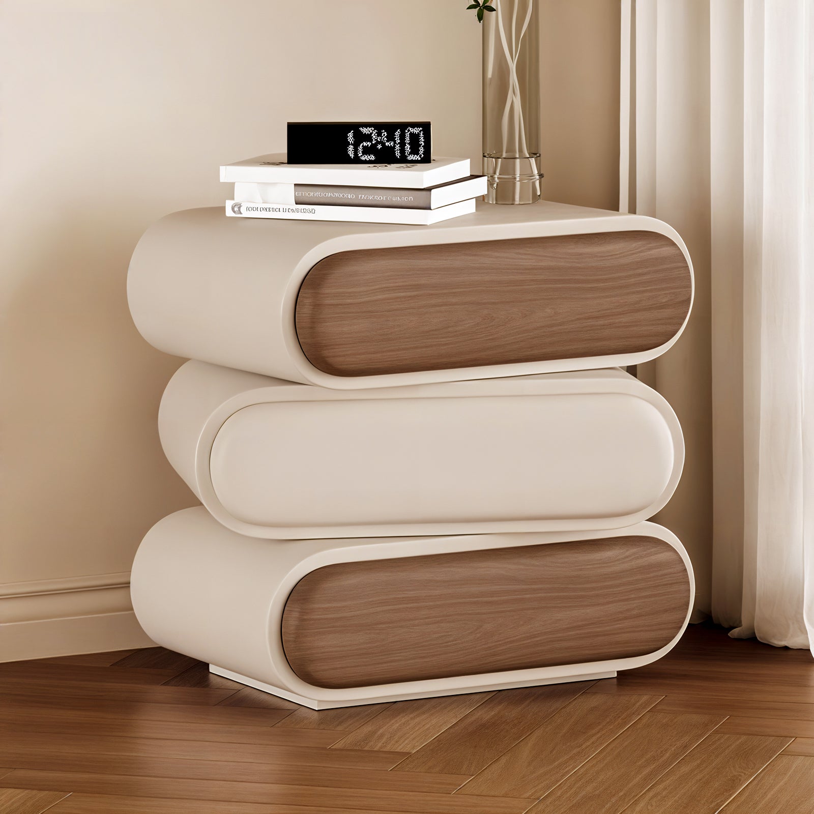 Enhance your bedroom decor with our modern minimalist beside table or named nightstand, designed to blend seamlessly with any contemporary living space. Crafted with a smooth, white exterior and natural wooden drawers, this bedside table not only offers a chic aesthetic but also provides ample storage space. The curved design adds a touch of elegance, making it a perfect addition to your modern home.