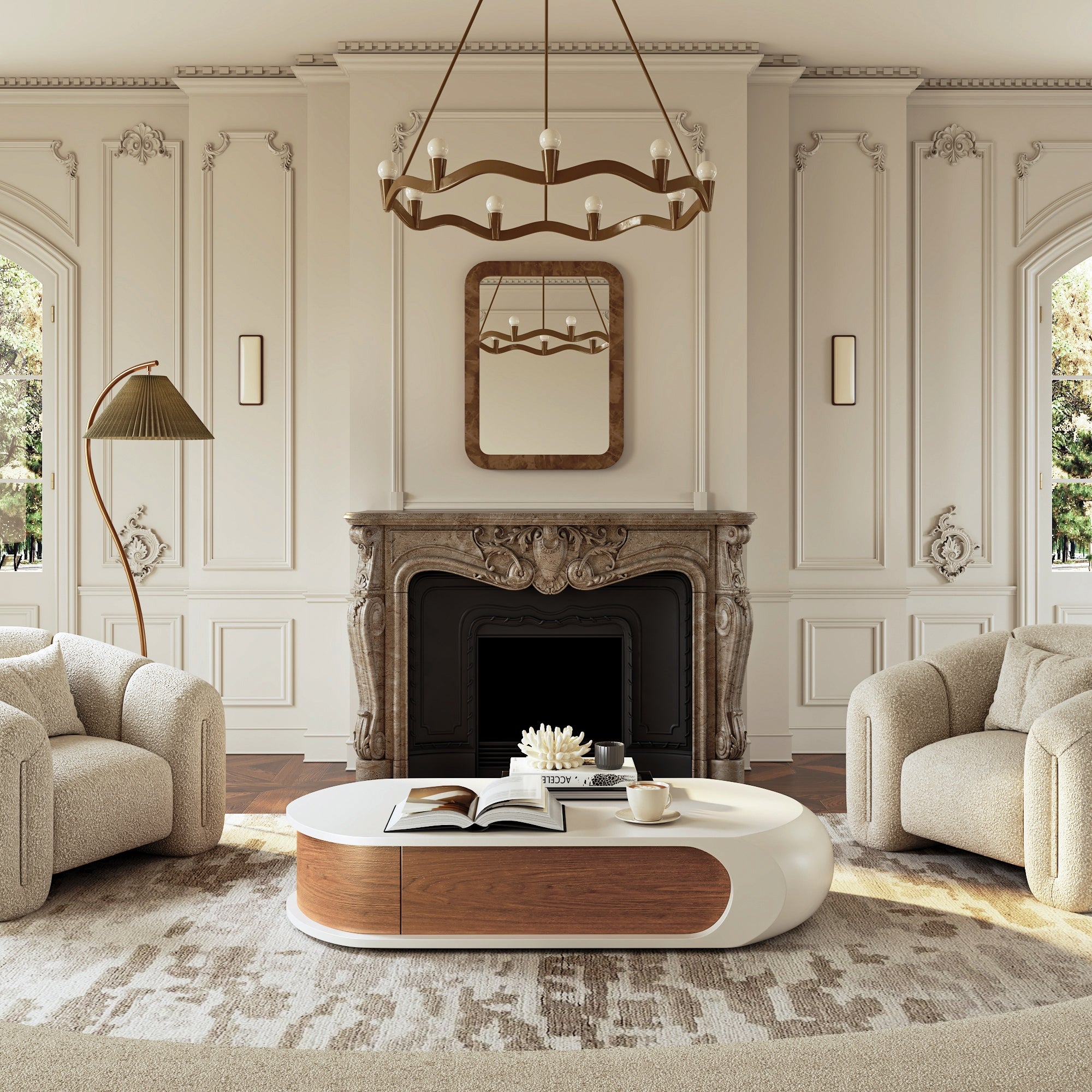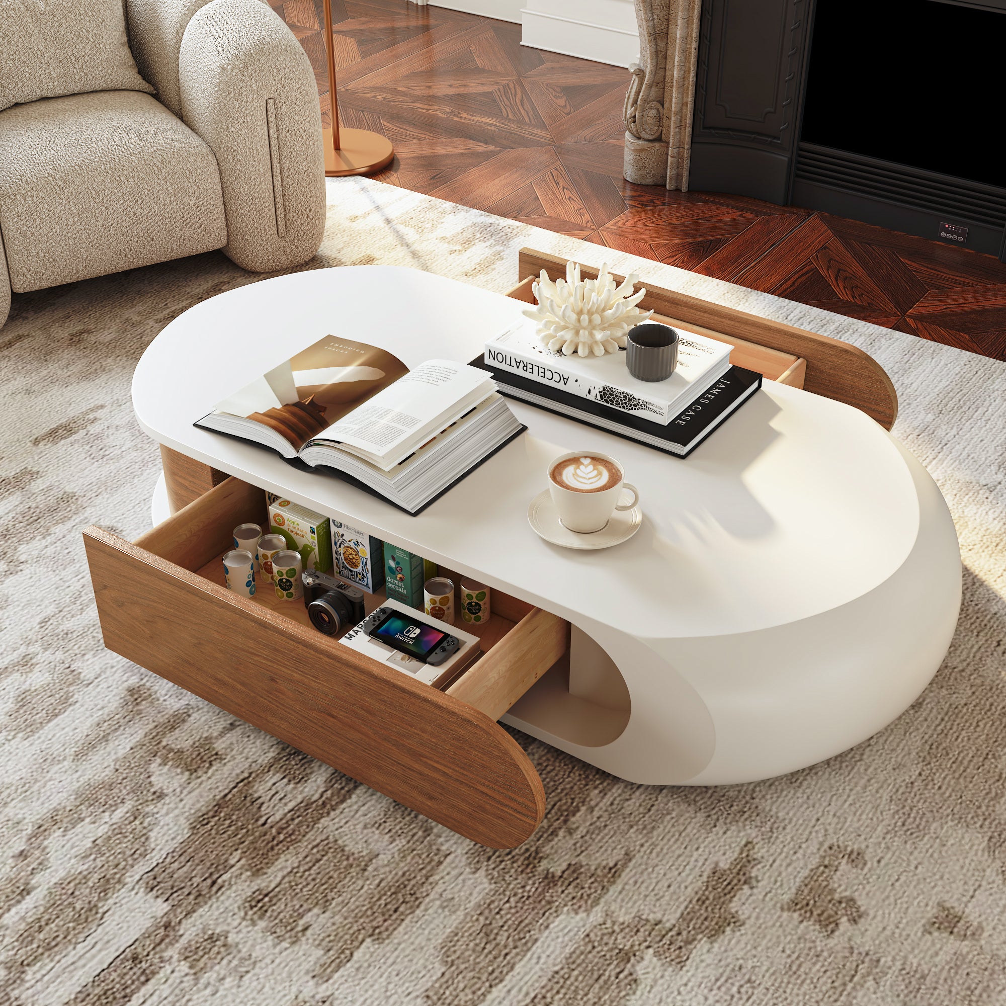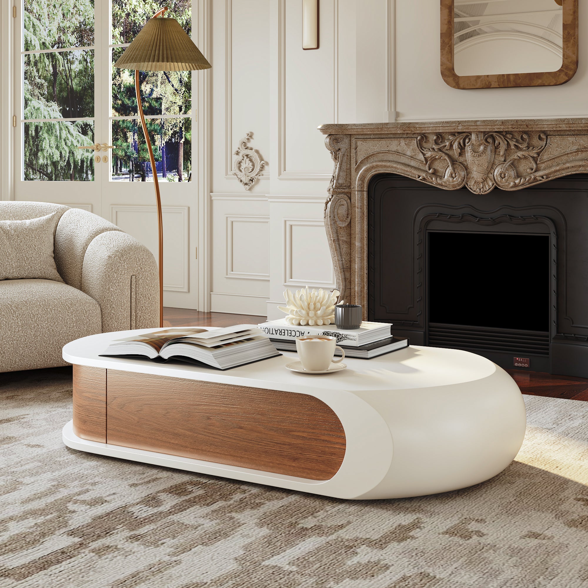 This coffee table features a smooth, rounded surface made from high-quality materials, complemented by two spacious drawers for convenient storage. The combination of white and natural wood finishes adds a touch of elegance and warmth, making it a versatile addition to any room.