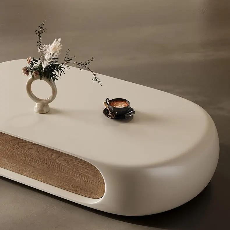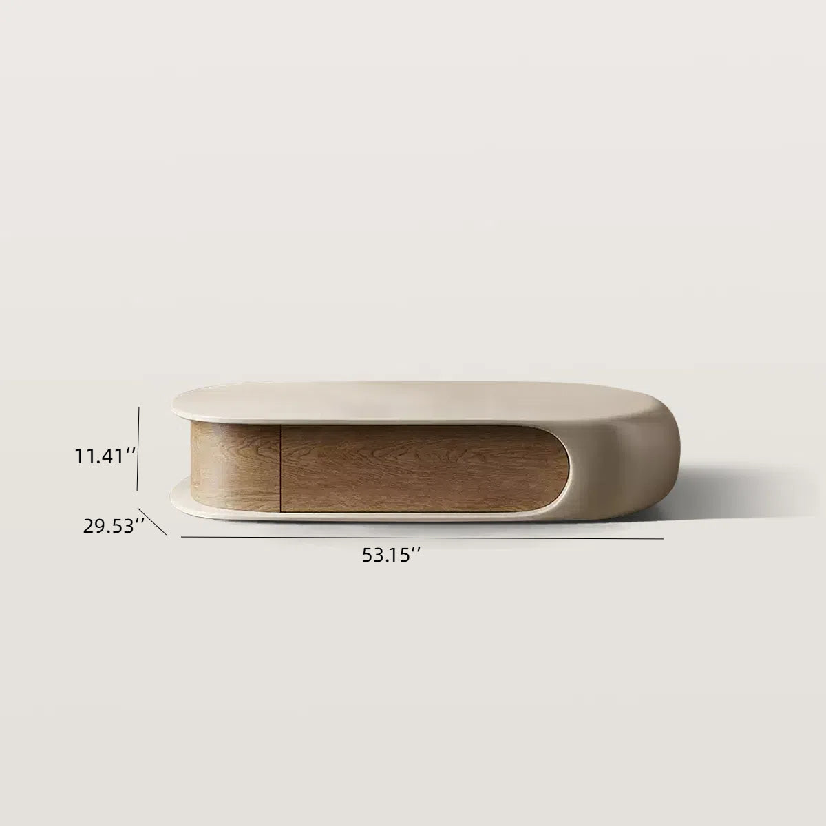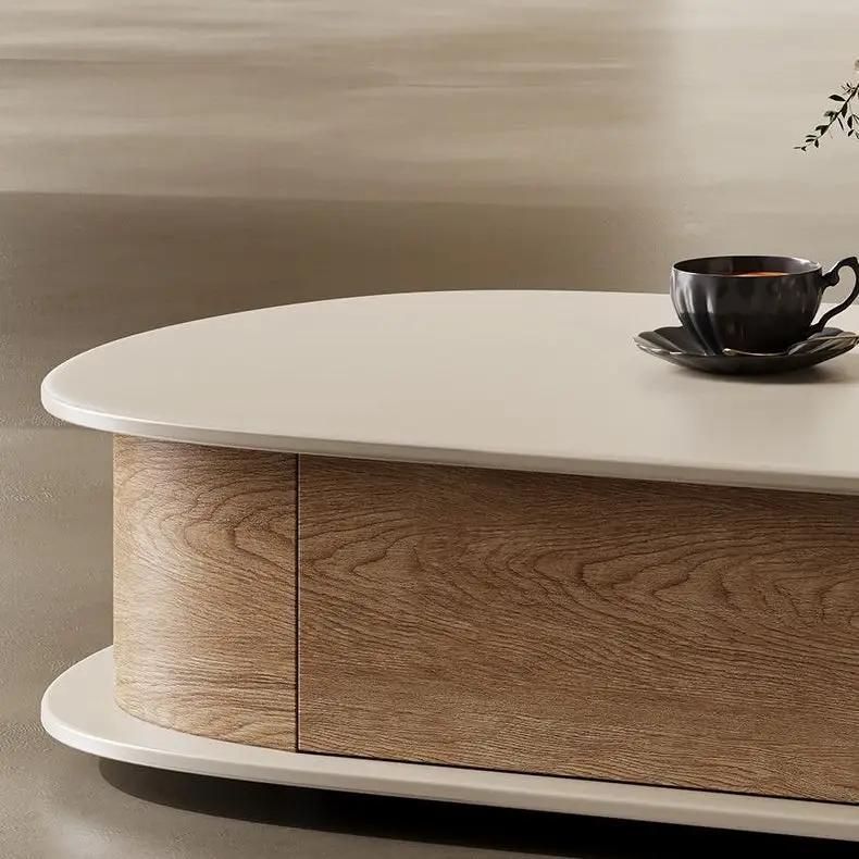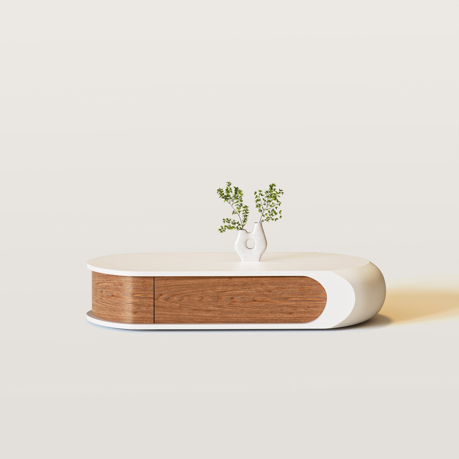 This coffee table features a smooth, rounded surface made from high-quality materials, complemented by two spacious drawers for convenient storage. The combination of white and natural wood finishes adds a touch of elegance and warmth, making it a versatile addition to any room.