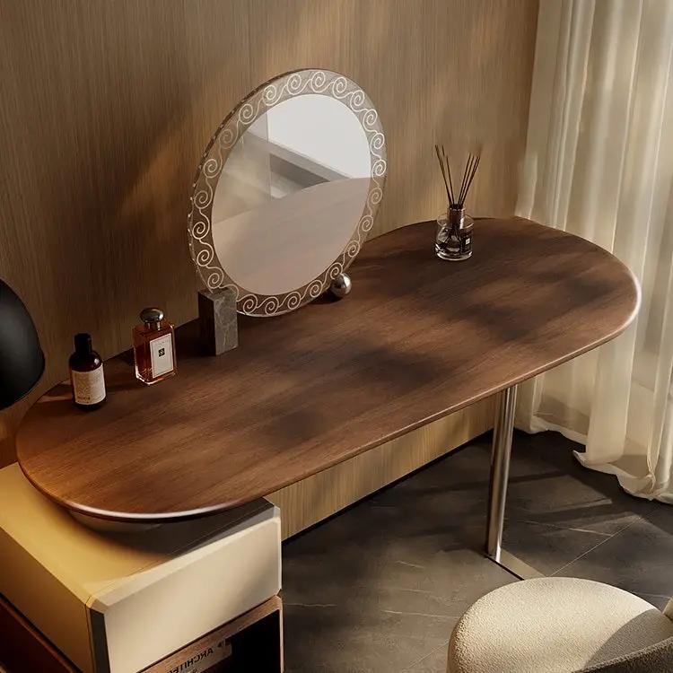 Elevate your beauty routine with this modern oval makeup vanity, designed to combine style and functionality seamlessly. The sophisticated walnut finish adds a touch of elegance to any room. Featuring a beautifully decorated mirror, this vanity provides a chic focal point for your makeup space. The vanity includes multiple storage drawers, ensuring ample space for organizing all your makeup, skincare products, and accessories. The sleek design with a combination of wood and metal elements enhances its contemporary look. The accompanying plush stool offers comfortable seating, making your beauty regimen a relaxing experience.