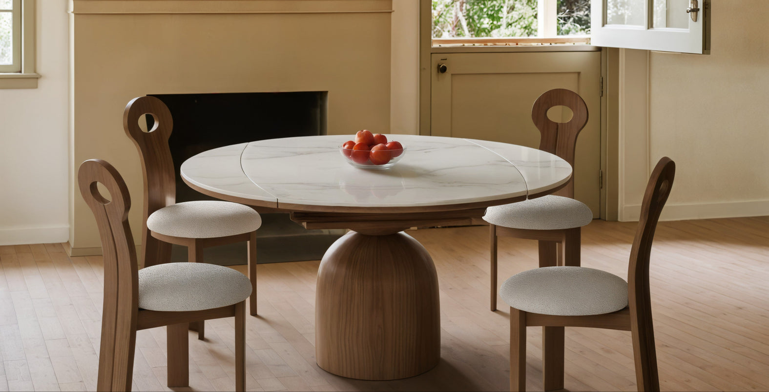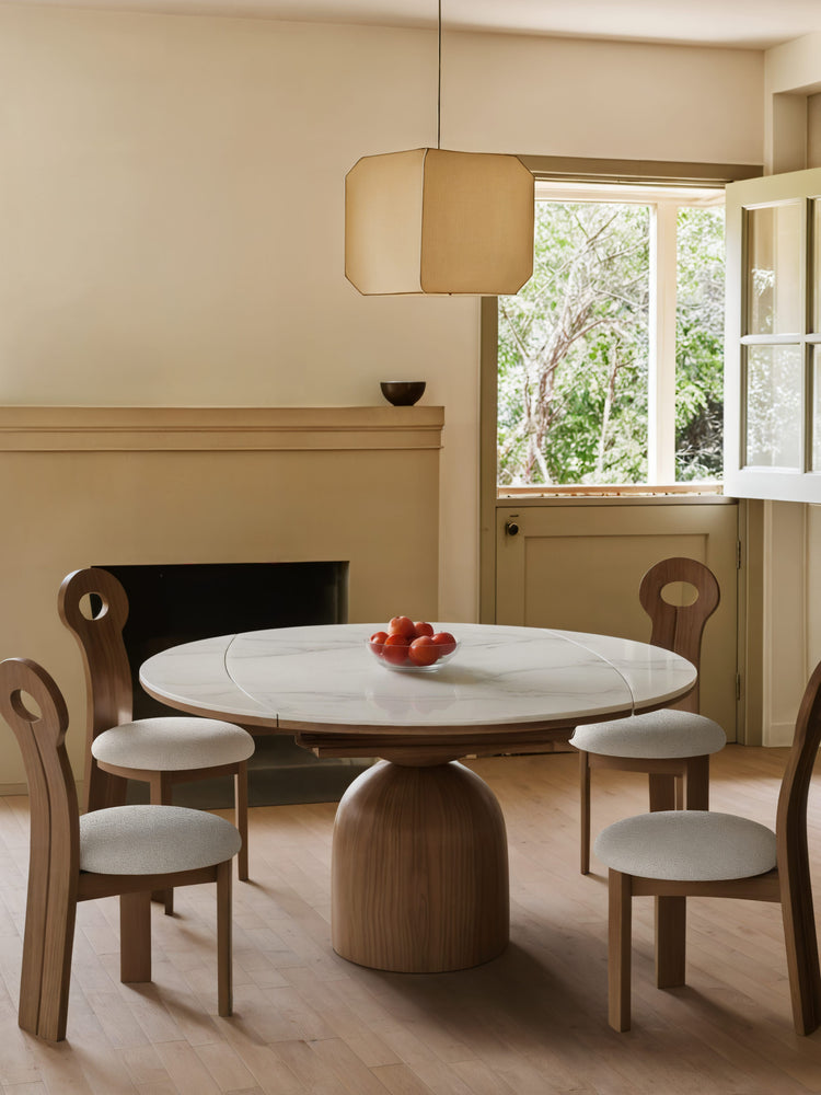 This simplistic modern extendable dining table designed with a sleek silhouette and finished in a warm lacquer. Accent wood grain detailing and fabric seating tie this kitchen table set together perfectly, being capable of creating a contemporary look in your kitchen area. Adjustable dining table length giving a beautiful dining table set to boost the beauty of dining-room with stylish style.