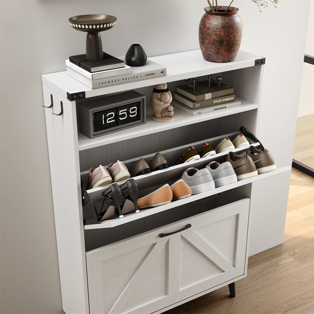 This shoe storage cabinet is built to withstand daily use and remain durable for years to come. It offers reliable storage solution for your beloved shoe collection. Its space-saving design featuring clever pull-down drawer design, allowing for easy access and efficient organization. Perfectly suited for entryways, hallways, foyers, or living rooms with limited space, this cabinet maximizes functionality while minimizing clutter.