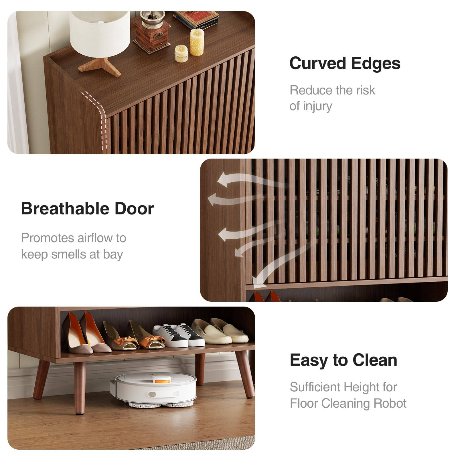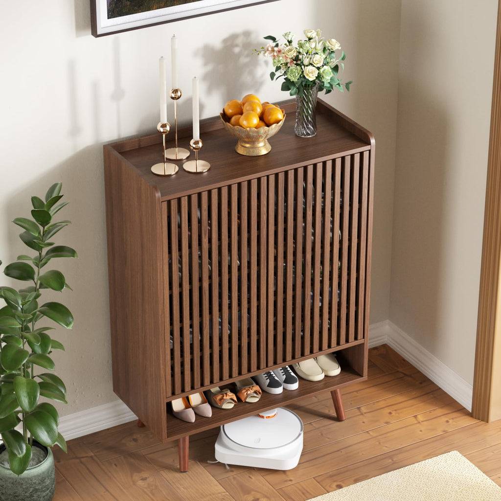 This slatted design wood shoe storage cabinet with five hidden shelves and the shelf can be adjusted. The top surface can hold bags, potted plants, or decorative items, and the bottom space provides ample room for slippers or a robot vacuum. This enclosed shoe cabinet keeps your shoes clean and eliminates cluttered hallways.