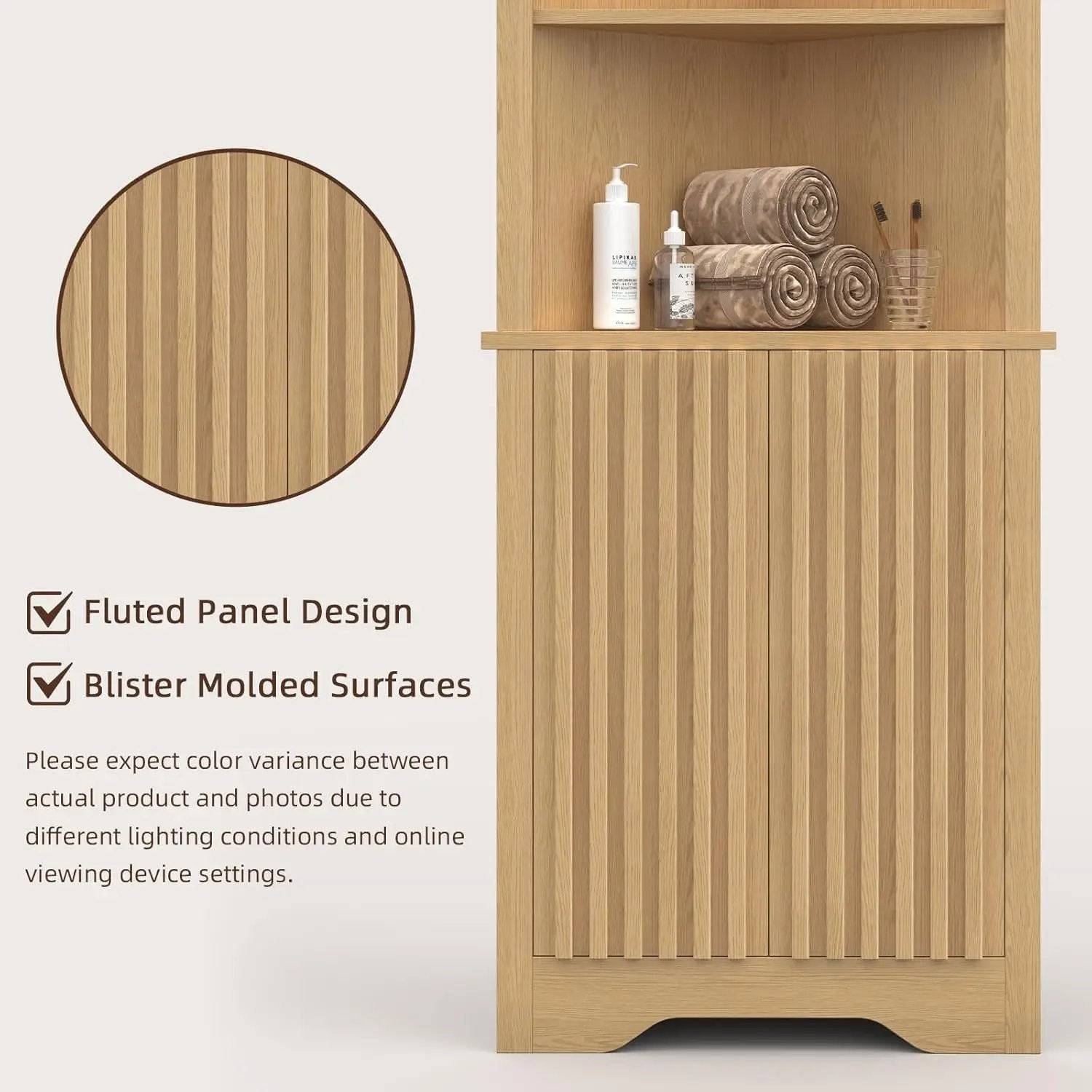Tall corner cabinet features a sophisticated curved design inspired by mid-century modern aesthetics. The rich natural finish and clean lines add a timeless elegance to any room, making it a perfect fit for contemporary or vintage-inspired decor. Its stylish appearance enhances your home's aesthetic while providing practical storage.
