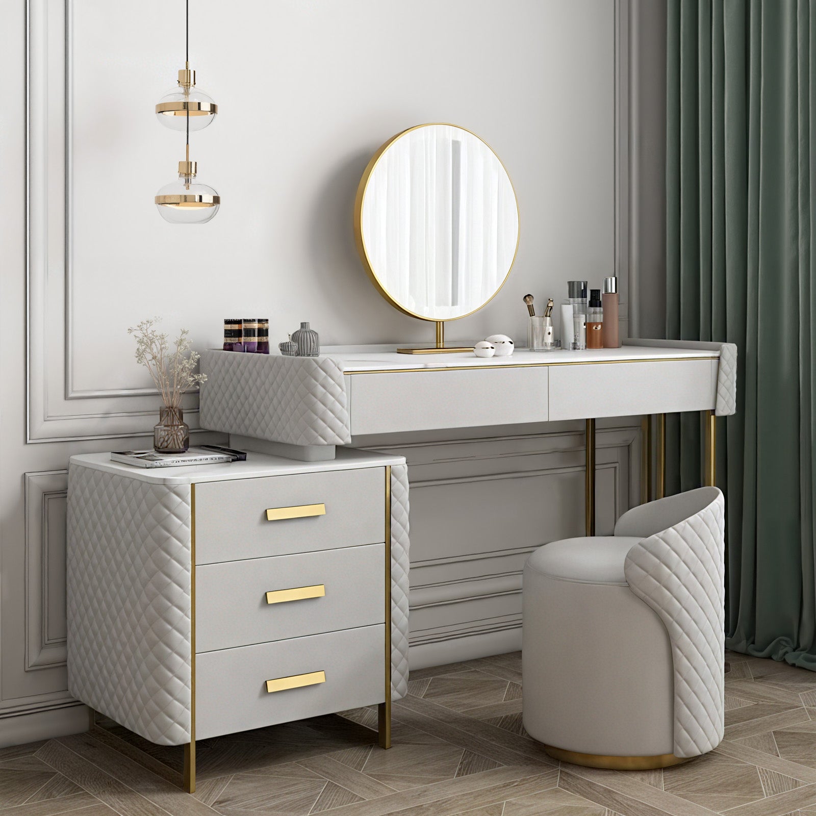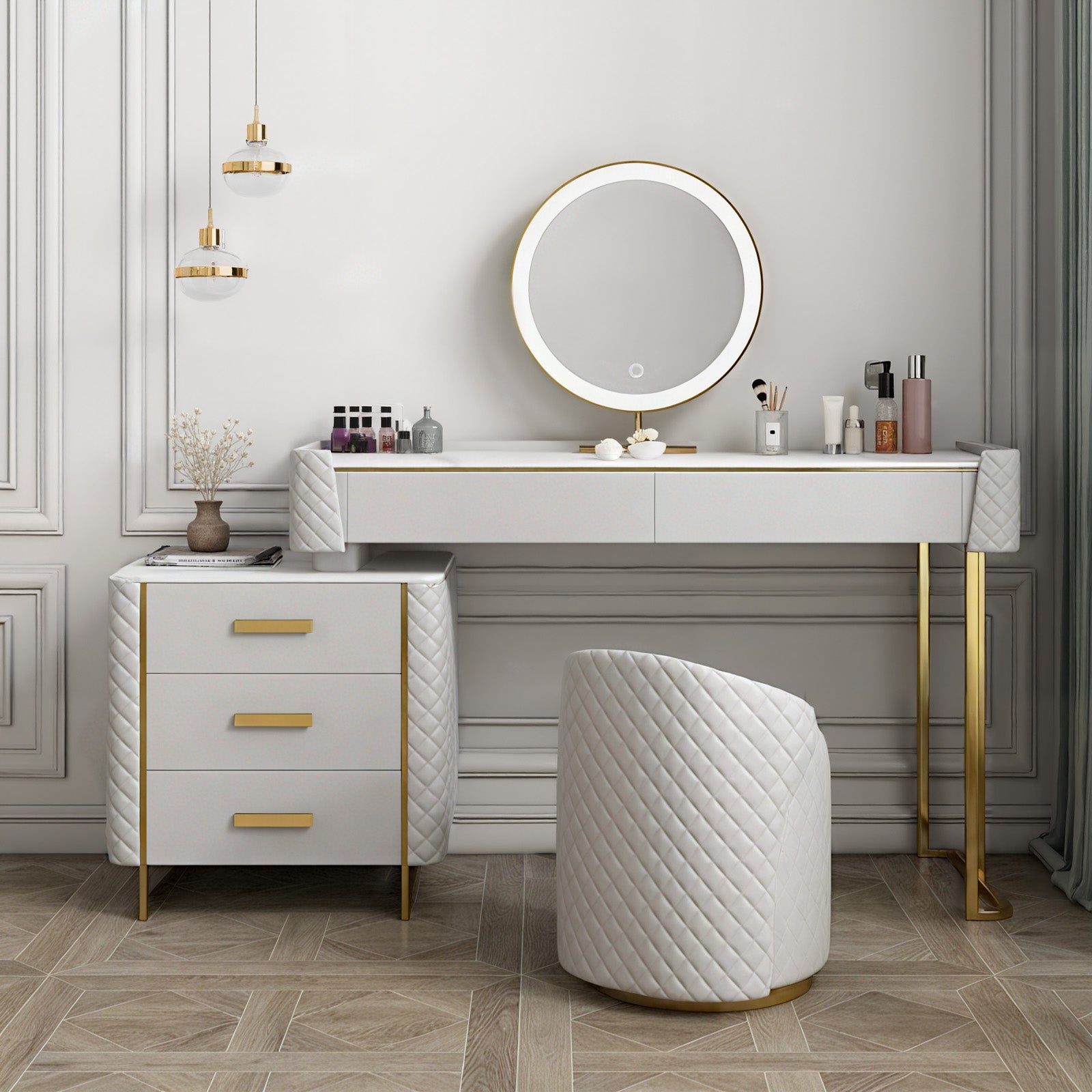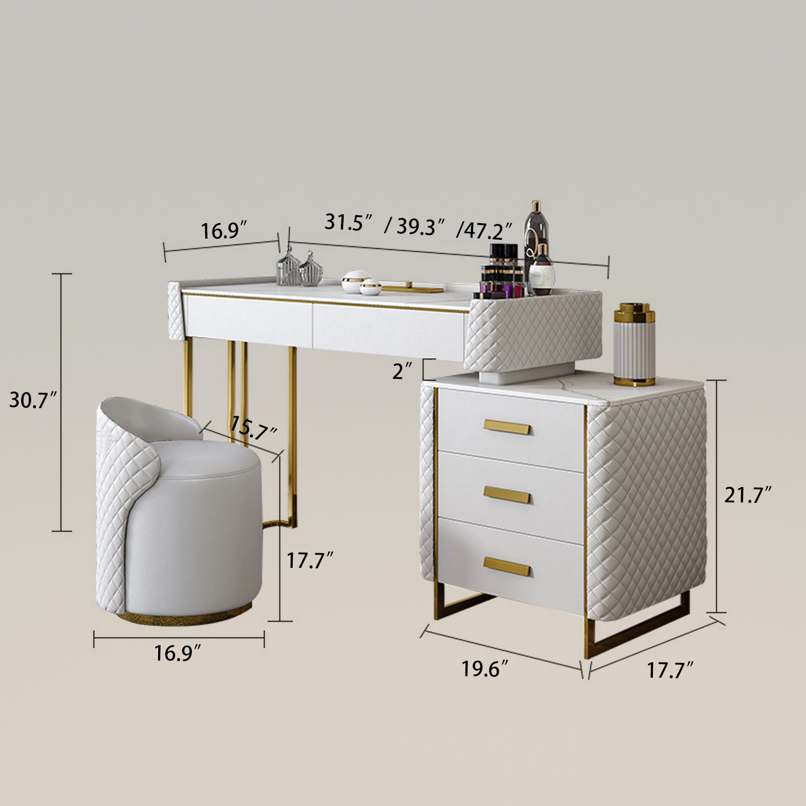 Let this graceful makeup vanity table help you keep your cosmetics and accessories tidy and in order. A drawer of the table is compartmentalized into blocks, which provides you orderly spaces to store your lipsticks, foundation, and beauty tools. Besides, there is a corner cabinet divided into two drawers that offer you ample space to store other necessaries. With a premium sintered stone tabletop, it is waterproof and anti-scratch, which is easy to maintain. Moreover, the combo of white and gold finish adds a sense of elegance to your room.