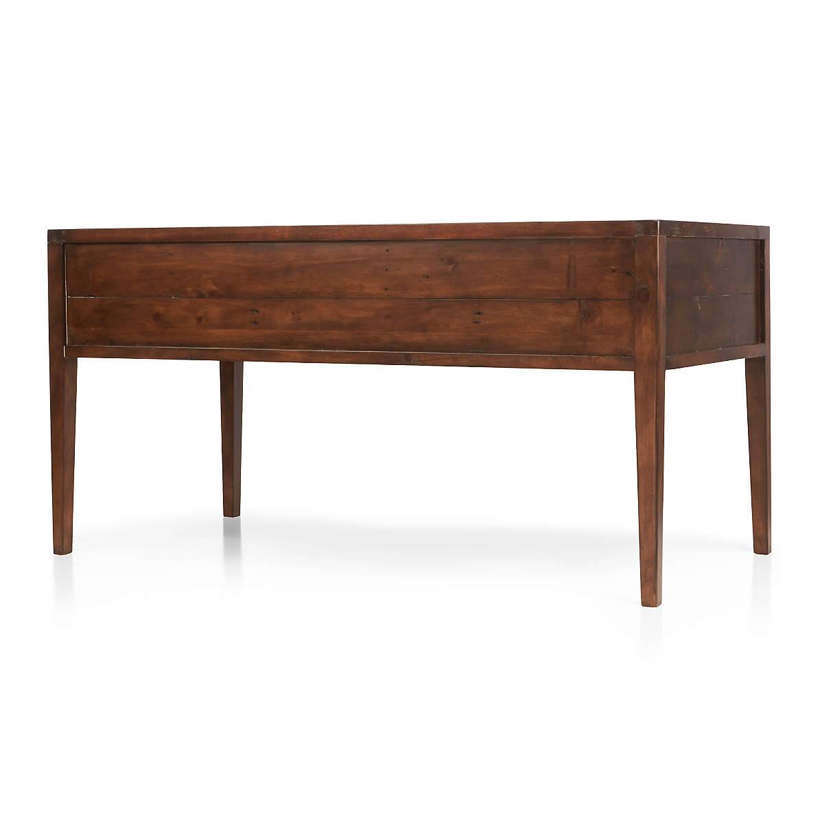 The vintage computer desk provides a 60"L x 30"W expansive top surface, suitable for various office supplies. The accompanying monitor stand ensures correct posture and eye-level positioning, increasing work comfort. Constructed from superior engineered wood, with a thickened top and base, this executive desk is robust. Its stylish and warm color scheme, enhanced by metal corner accents, combines rustic style with a touch of elegance.